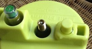 To test, pressurize the container with balls inside to 3o psi. With a dropper, syringe, teaspoon or similar, completely fill the annular space of the button with water, as shown in the photo.